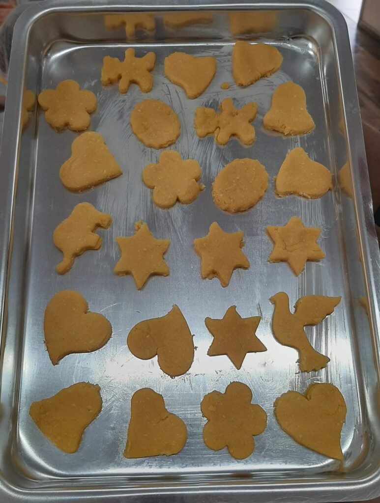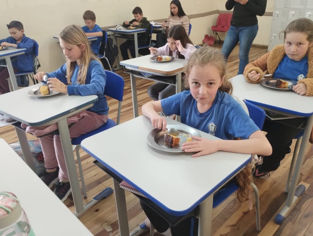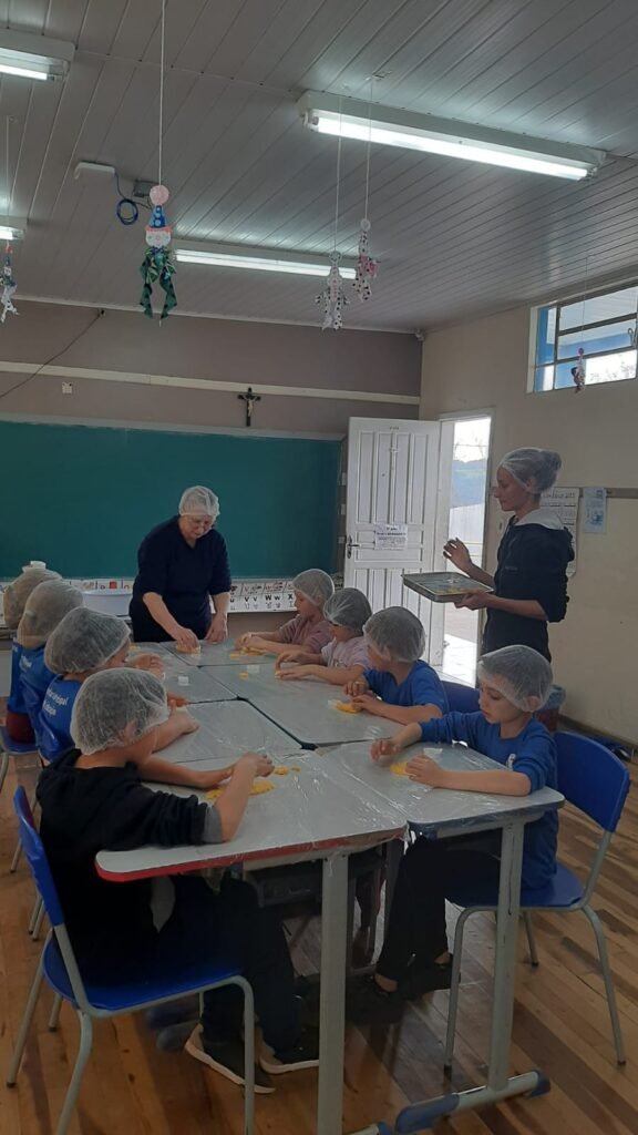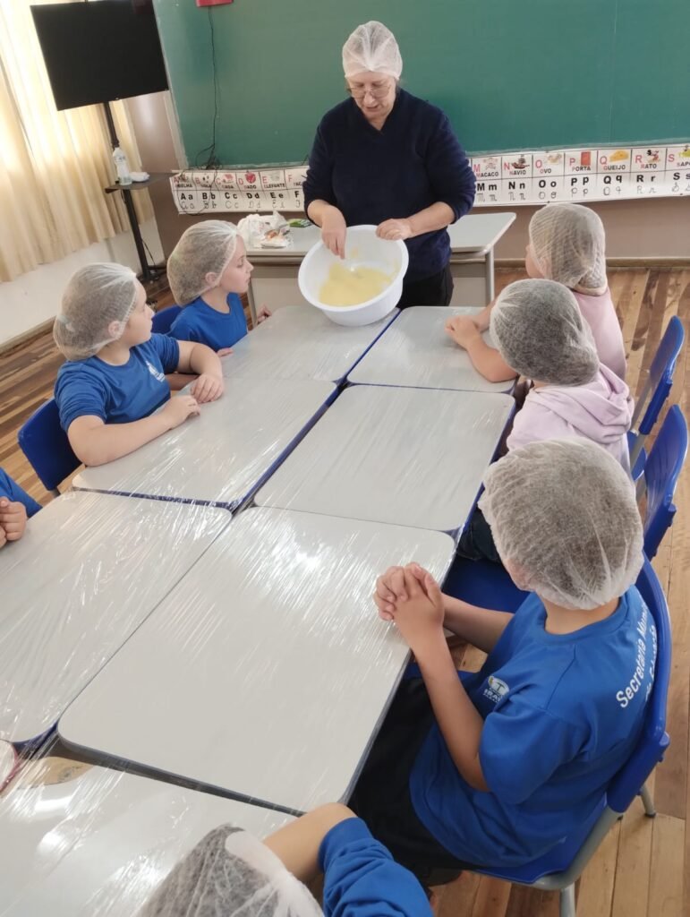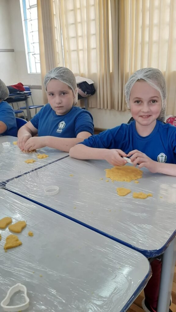 Em outra etapa, os alunos participaram da produção de bolachas feitas com derivados do milho, aprendendo sobre medidas, higiene, ingredientes e trabalho em equipe. A experiência estimulou a coordenação motora fina, o raciocínio matemático e o prazer de cozinhar de forma saudável e criativa.